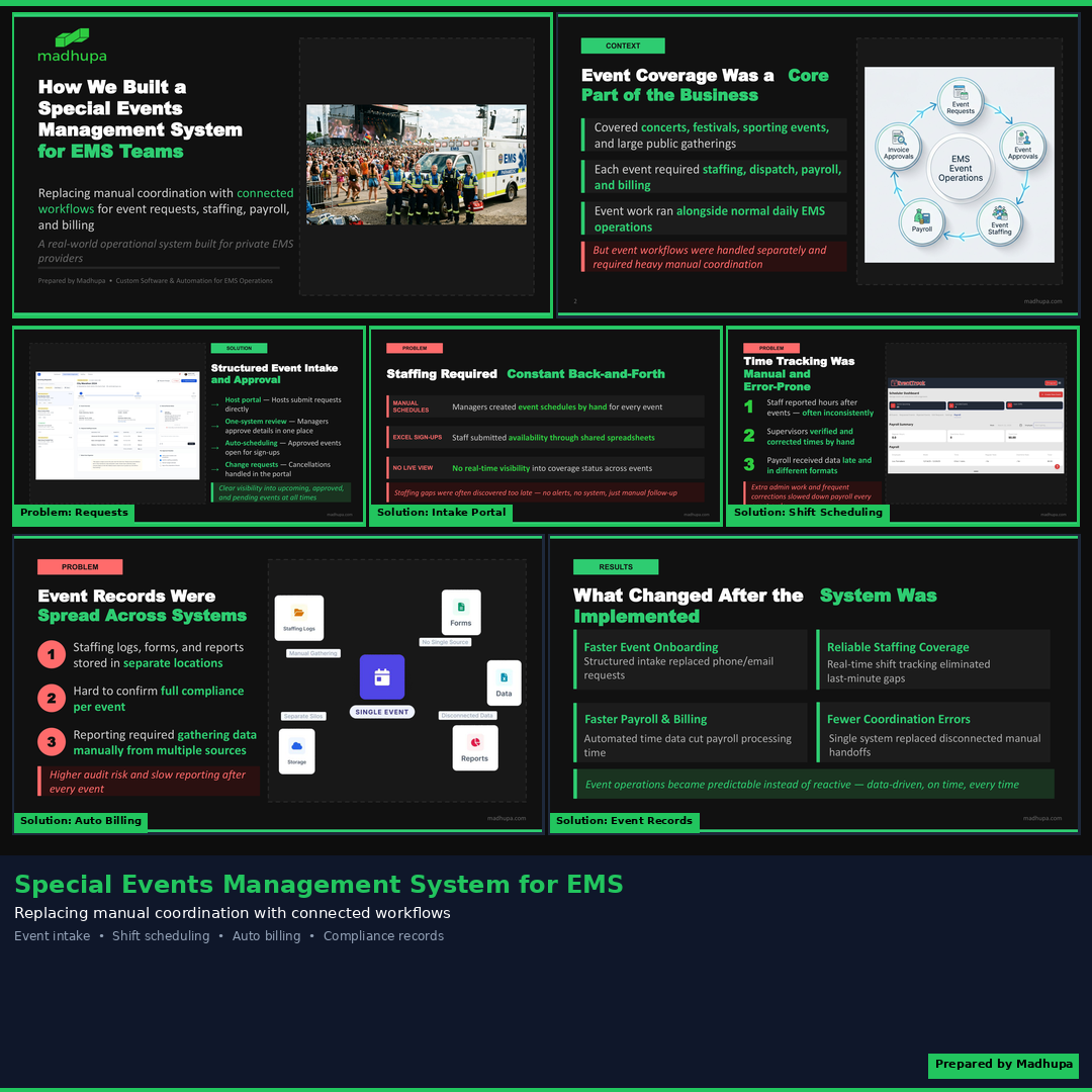 Replacing manual coordination with connected workflows for event requests, staffing, payroll, and billing.